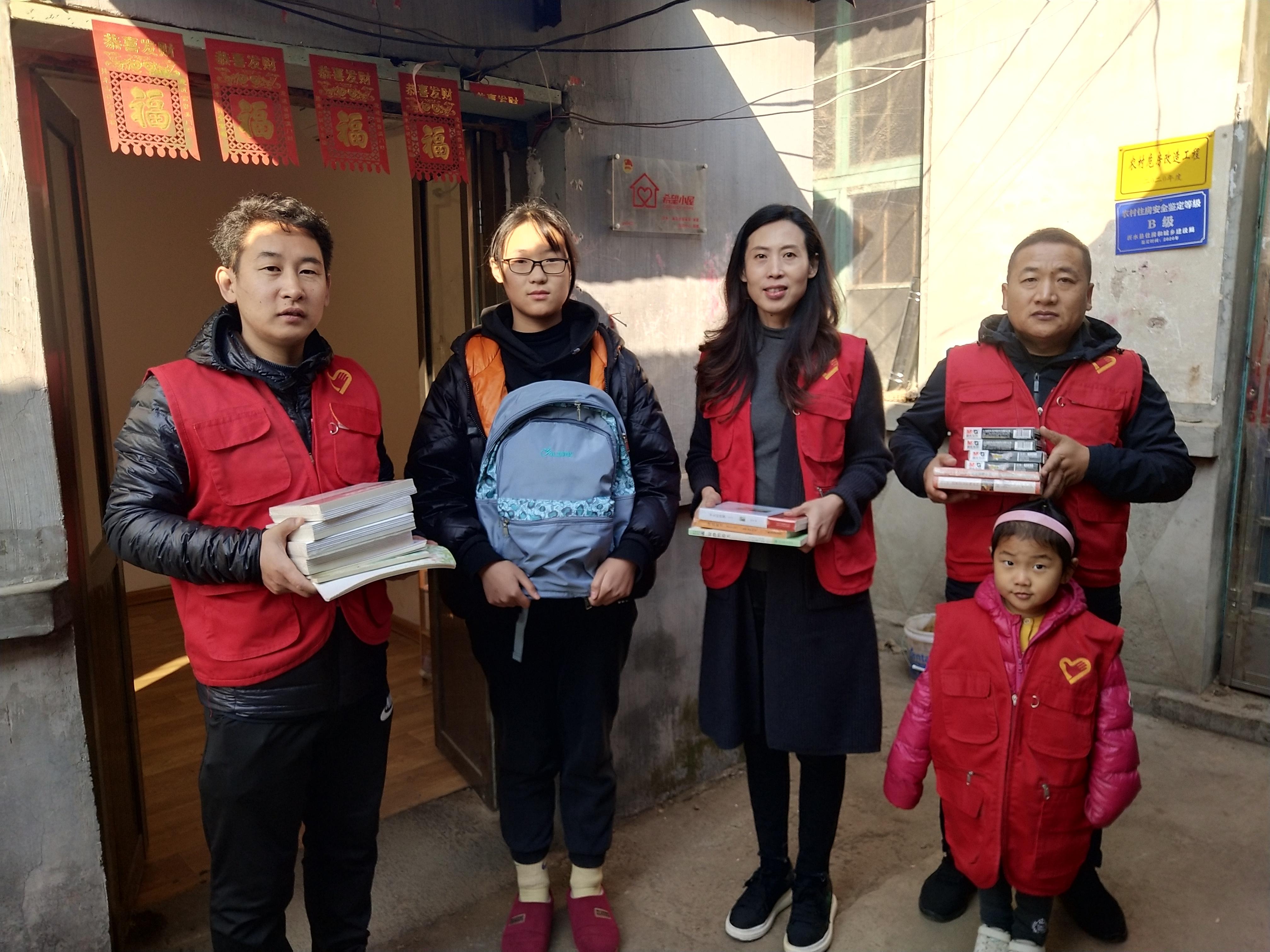 志愿者们给贫困学生带去书包、笔记本、文具盒、笔等学习用品以及《傅雷家书》、《平凡的世界》、《钢铁是怎样炼成的》等中学课外必读书目;还详细询问了贫困学生近期学习情况,对存在弱项的数学科目进行了有针对性辅导。自开展“希望小屋”建设以来,志愿者们利用节假日或周末,经常性的为她提供学习生活上的帮助,鼓励引导她不因家庭情况而自卑,不抱怨、不气馁,树立自强、自信、自爱,阳光乐观、积极向上的人生价值观。