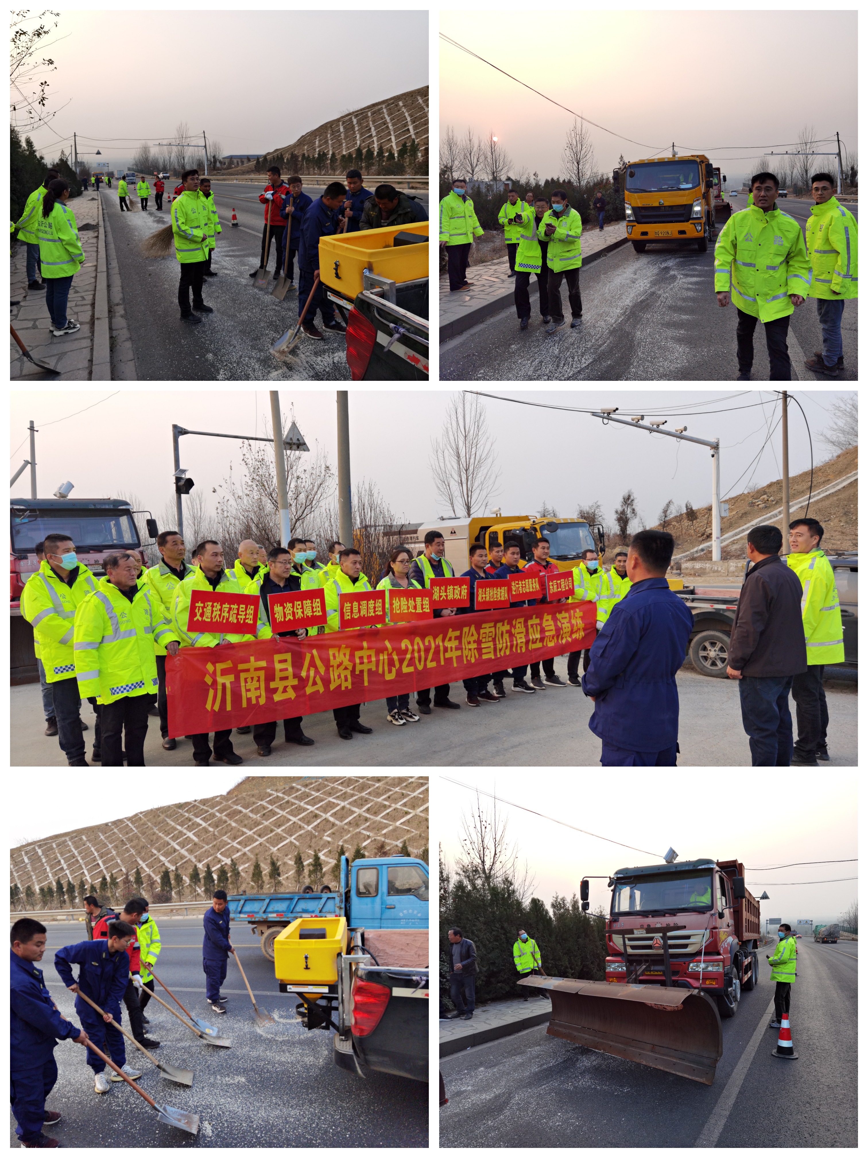 为切实做好冬季冰雪天气应急处置工作,有效防范与处置路面冰雪灾害,全面提高应对冰雪天气的快速反应能力和应急处置能力,努力降低冰雪天气对交通造成的不利影响,更好的为人民群众安全出行服务,12月6日下午14点30分,沂南县公路中心联合湖头镇政府、湖头镇抢险救援队、东辰路桥公司、逆行者消防志愿服务队在S313线99K+557--900左侧举行了2021年度冬季除雪防滑应急演练活动。