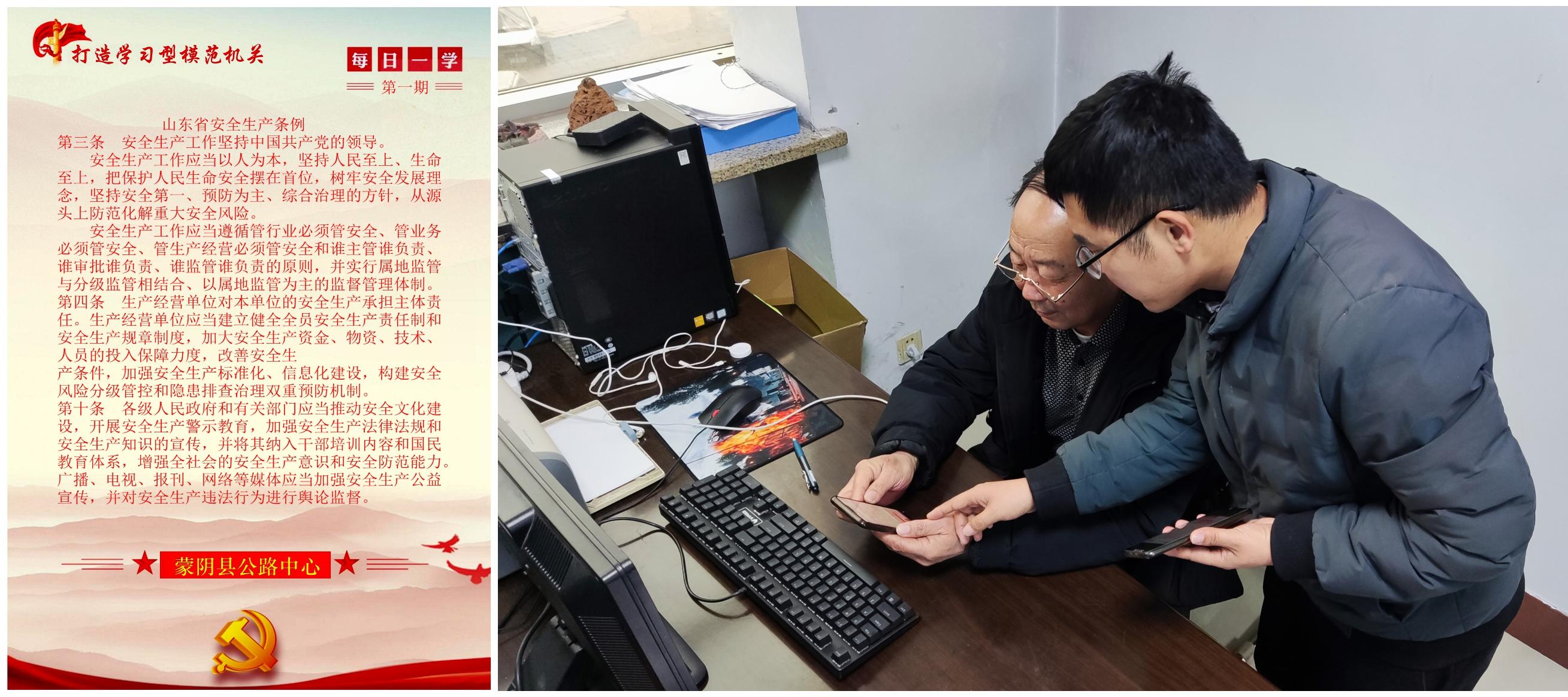 1月24日,蒙阴县公路中心《打造学习型机关——每日一学》第一期在微信工作群发布。这是该中心“开新局·谱新篇”学习培训活动的又一创新举措。
