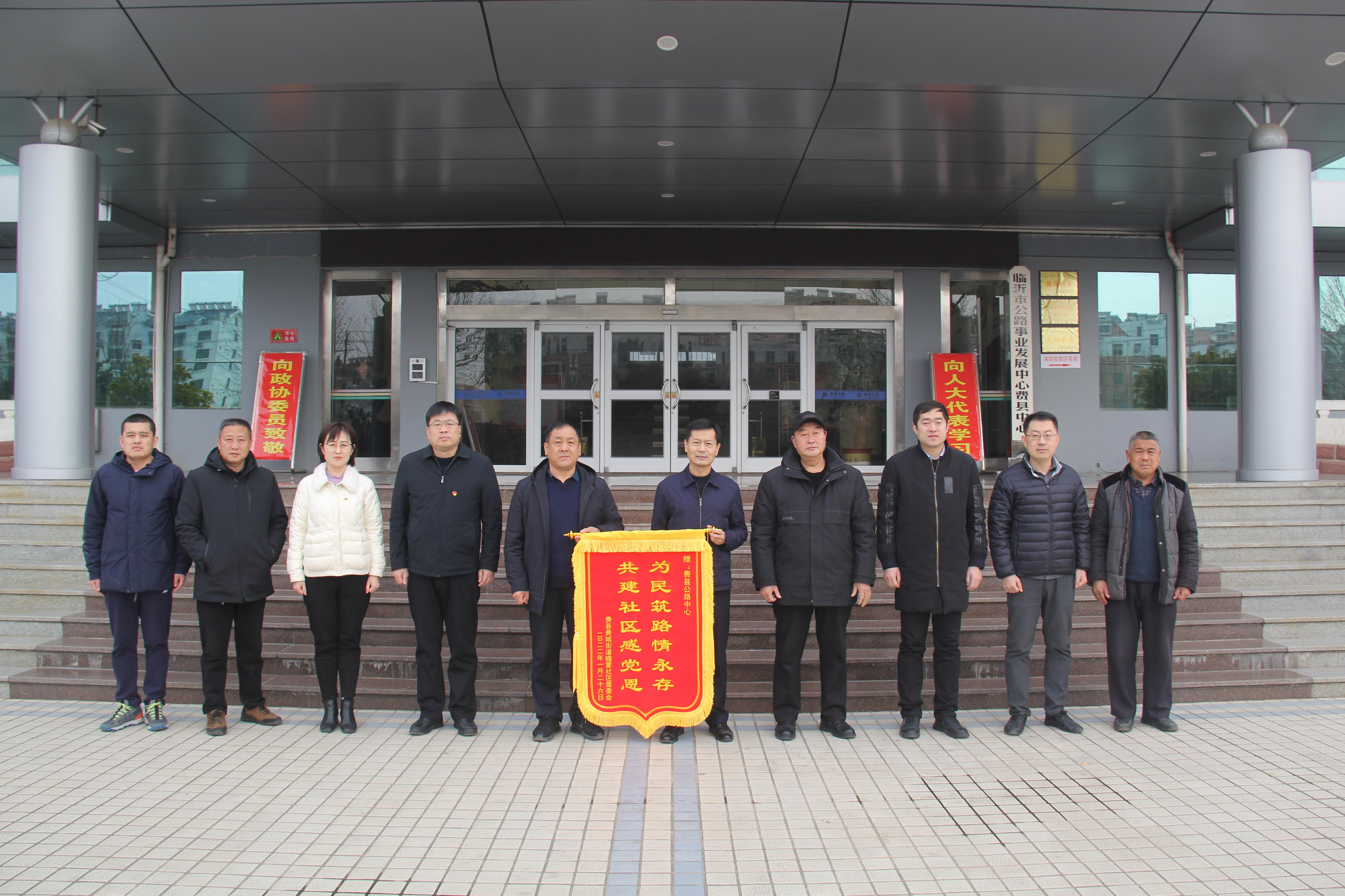 2022年1月27日上午,费县瞻蒙社区把一面写有“为民筑路情永存、共建社区感党恩”的锦旗送到费县公路中心,感谢近年来该中心对费县瞻蒙社区工作的大力支持。