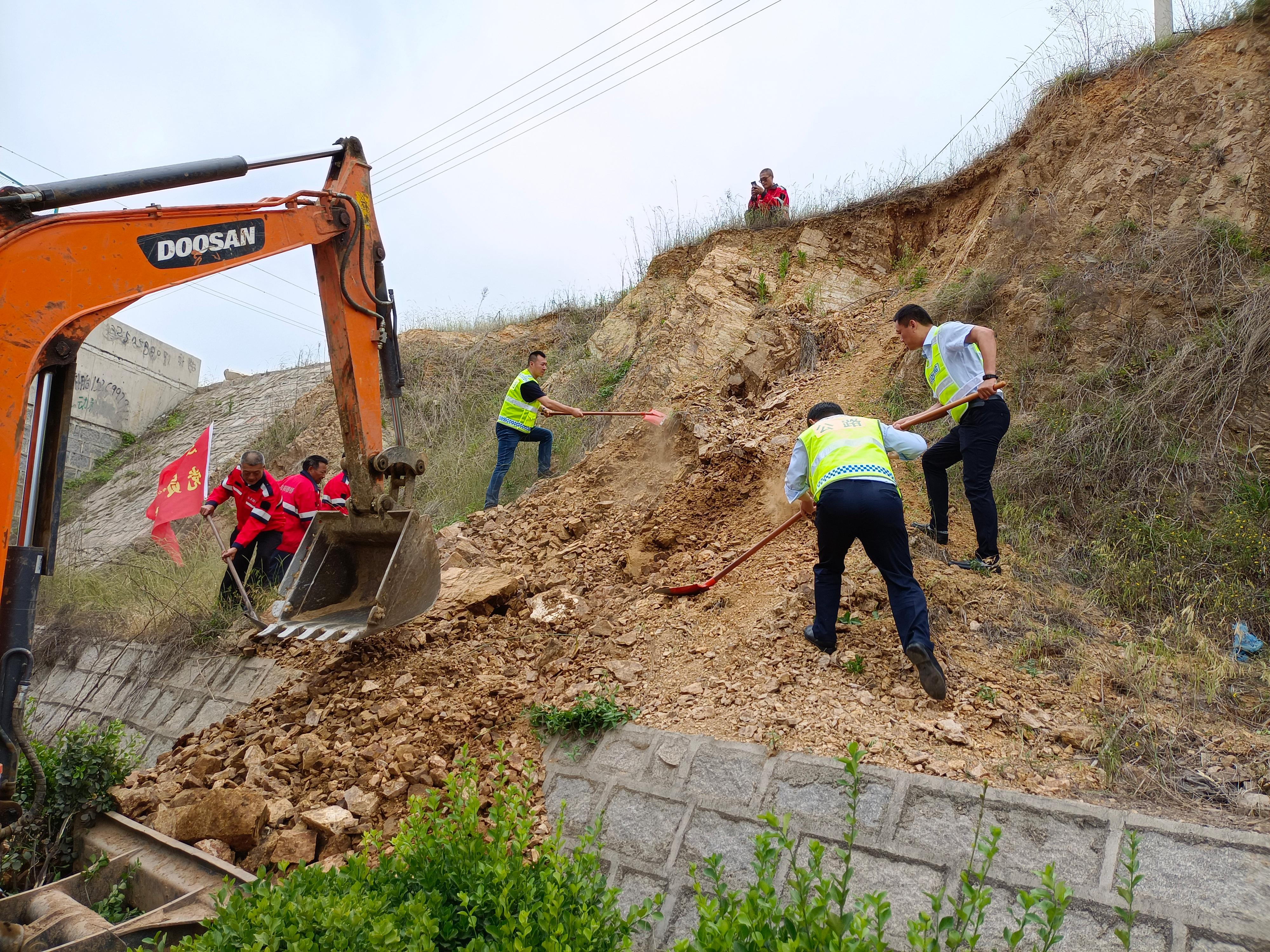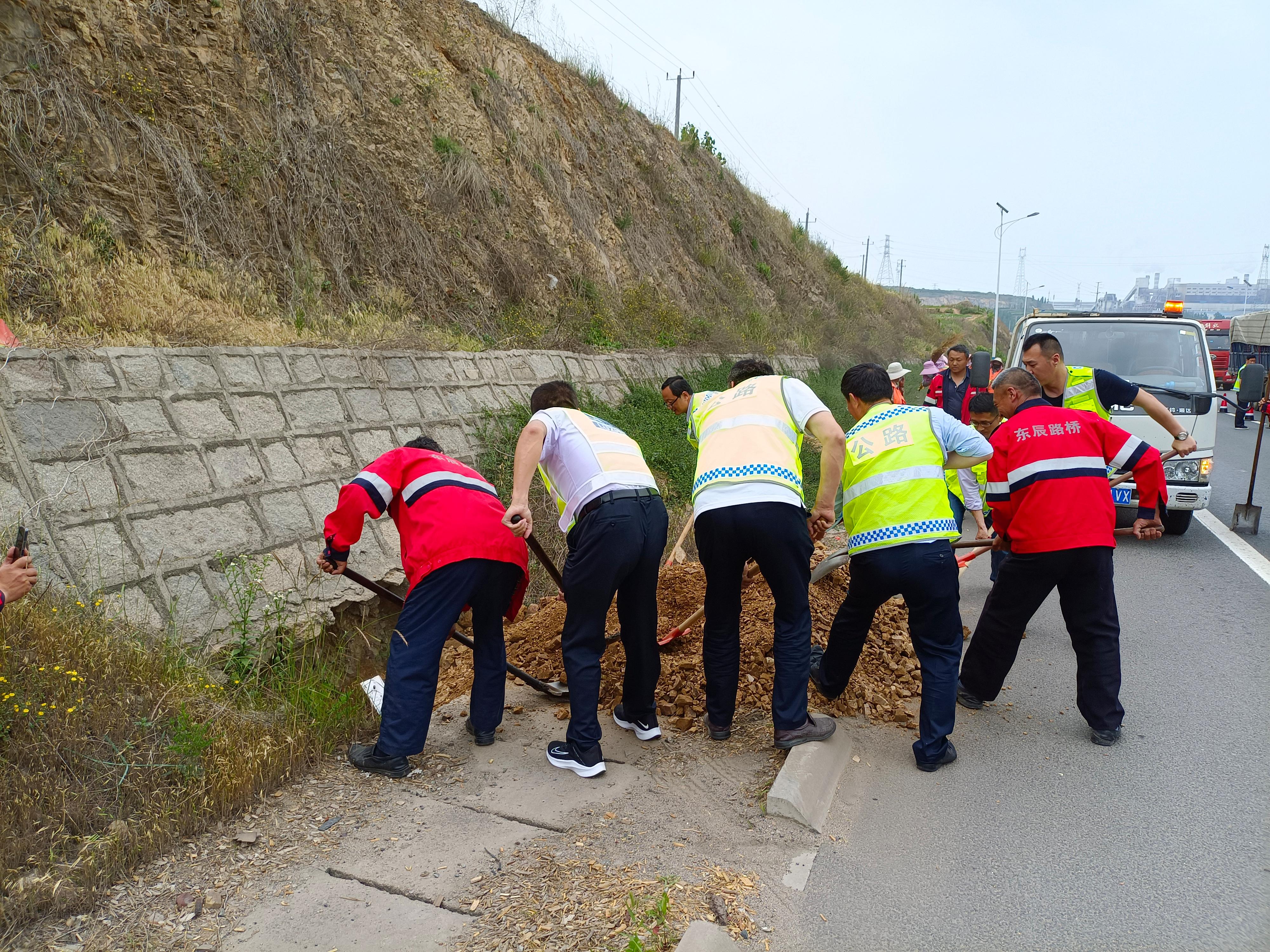 演练现场,随着总指挥的一声令下,模拟演练正式开始。莒南县公路中心、县交警大队、临沂市东辰路桥工程有限公司应急抢险队伍迅速赶赴演练现场,各小组各负其责,交通疏导小组速摆放交通警示标志,维持交通秩序、疏导受损车辆和人员,维护现场抢险安全;技术评估人员迅速查看边坡塌方和水毁情况,进行初步统计,制定抢险计划;抢险人员和机械迅速进场处置边坡塌方和水毁。经过1个多小时奋战,险情被及时排除,演练圆满结束。
