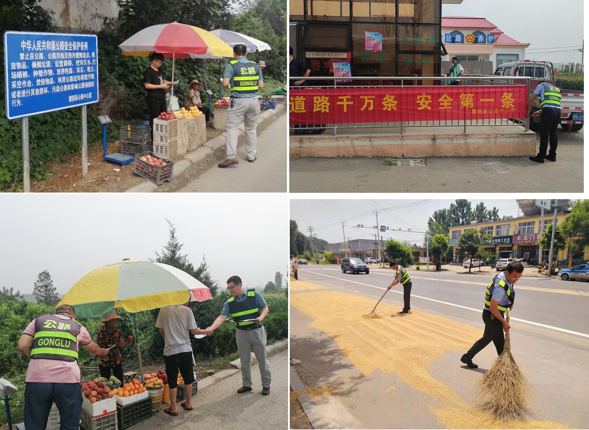 入夏以来,蒙阴蜜桃等水果农作物进入成熟期,国省道干线公路沿线果农在道路两侧摆摊设点交易果品,集市贸易和小麦晾晒侵占道路现象也时有发生,给过往车辆带来严重安全隐患。该中心坚持“生命至上、安全第一”理念,落实安全主体责任,组织路产保护科与安全科积极开展整治活动,争取沿线群众的理解与支持。在G205安乐庄和陡山、G342跨湖桥摆摊较严重路段安装《中华人民共和国公路安全保护条例》宣传牌6块,与摆摊商贩耐心解释其违法行为带来的安全隐患,发放宣传材料160余份,清理摊点30余处。发现利用公路晒粮2处,工作人员向晒粮人员解释其违法行为的危害,并帮助群众一起打扫公路晾晒的小麦。