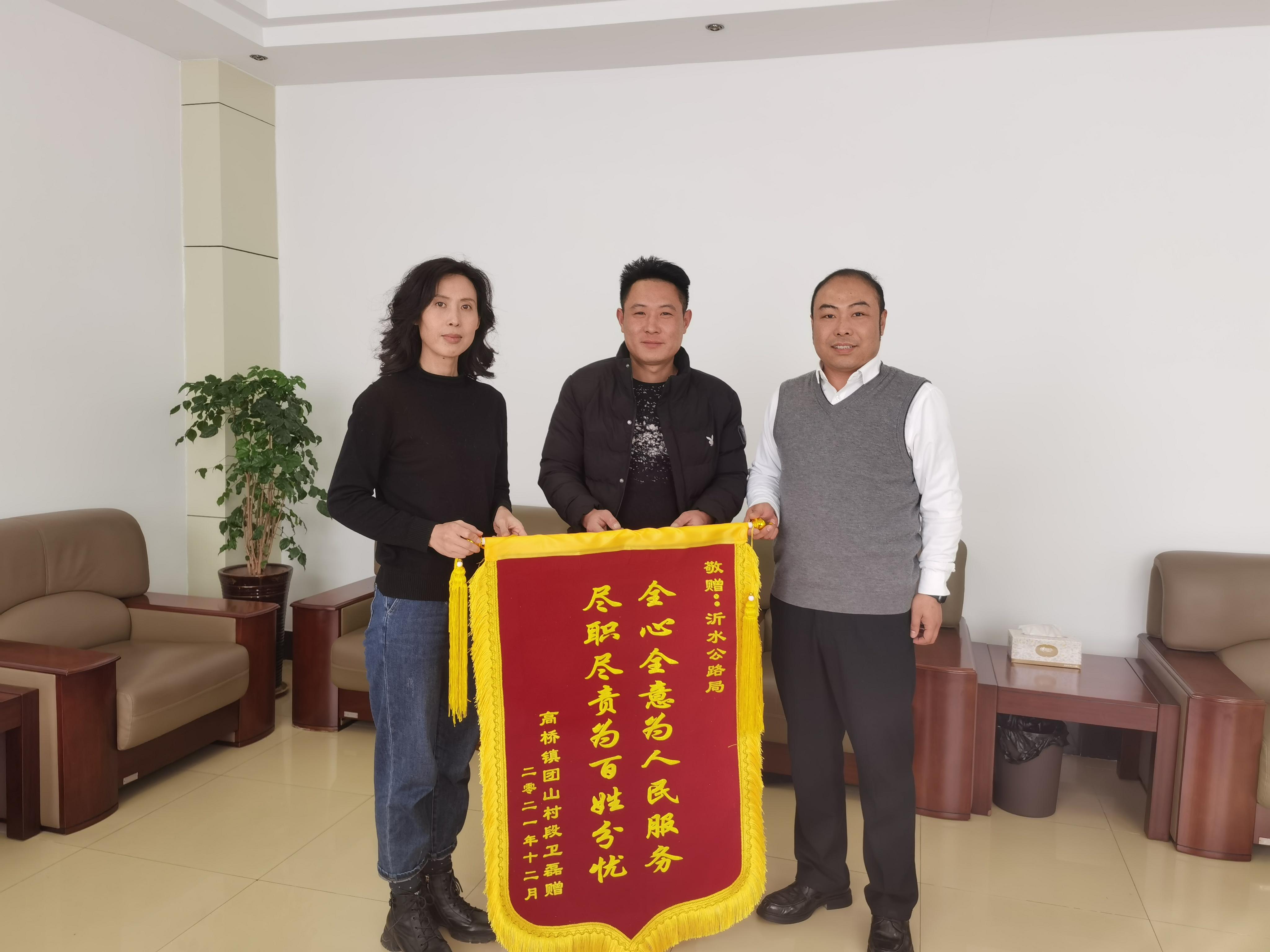2022年1月27日15时许,高桥镇团山村村民段某来到沂水县公路中心,郑重地将一面“全心全意为人民服务·尽职尽责为百姓分忧”的锦旗送给沂水县公路中心,并再三表示感谢。