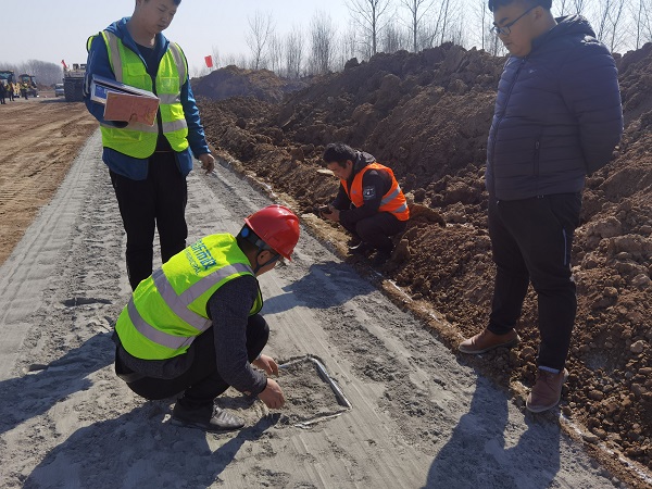 该项目路床上部40cm均为4%水泥稳定土的结构层处理,平均处理宽度35m,分两层施工(每层20cm)。项目起点至郯薛线6公里,回填风化料施工基本完成,具备水泥土施工条件。K0+940-K1+160(左幅)第一层水泥稳定土作为首件试验段,长度为:220m,水泥稳定土平均宽度18.1m,厚20cm,面积约为3982㎡。水泥土施工将采用压茬施工的方式开展,回填一段路基、施工一段水泥土,确保汛期之前完成水泥土施工任务。